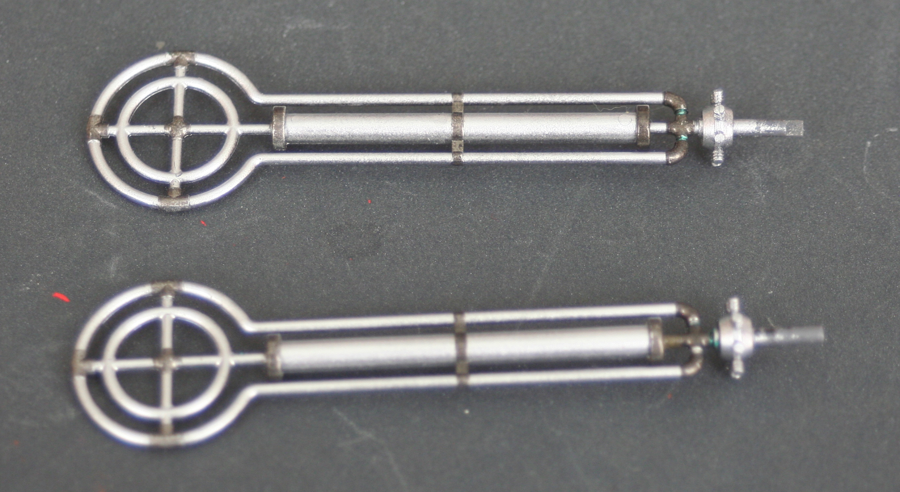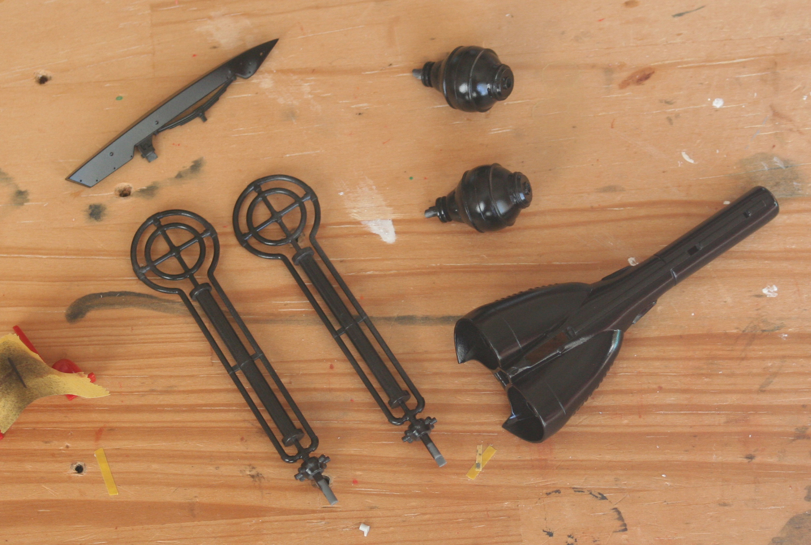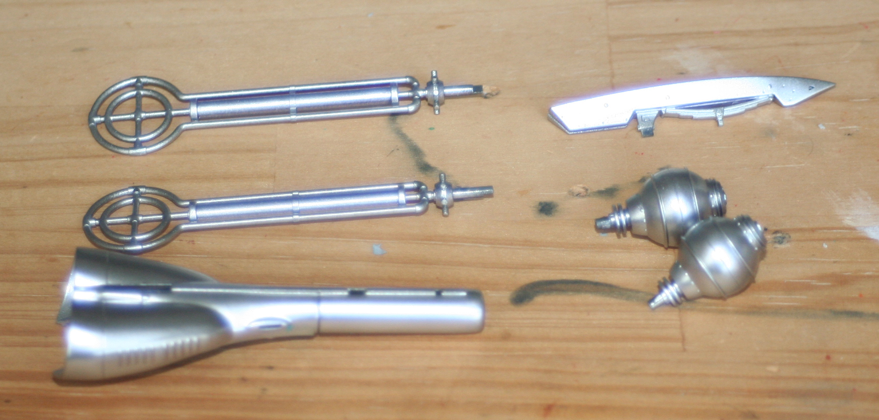 今回は飛行状態でという依頼ですので固定バーにセットするクリアパーツの機体部分をシルバーのあとこちらも焼鉄色で仕上げました。