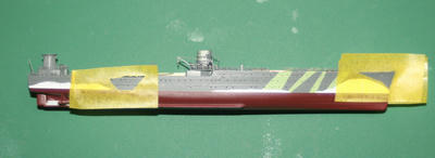 まずは喫水線より下を艦底色で塗ります。