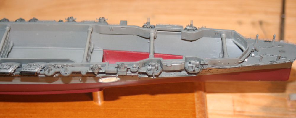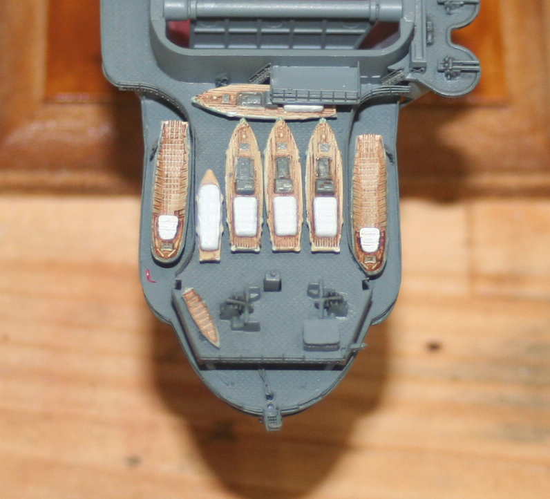 後部デッキに艦載艇を載せて船体下部の組み立ては一通り完了です。
