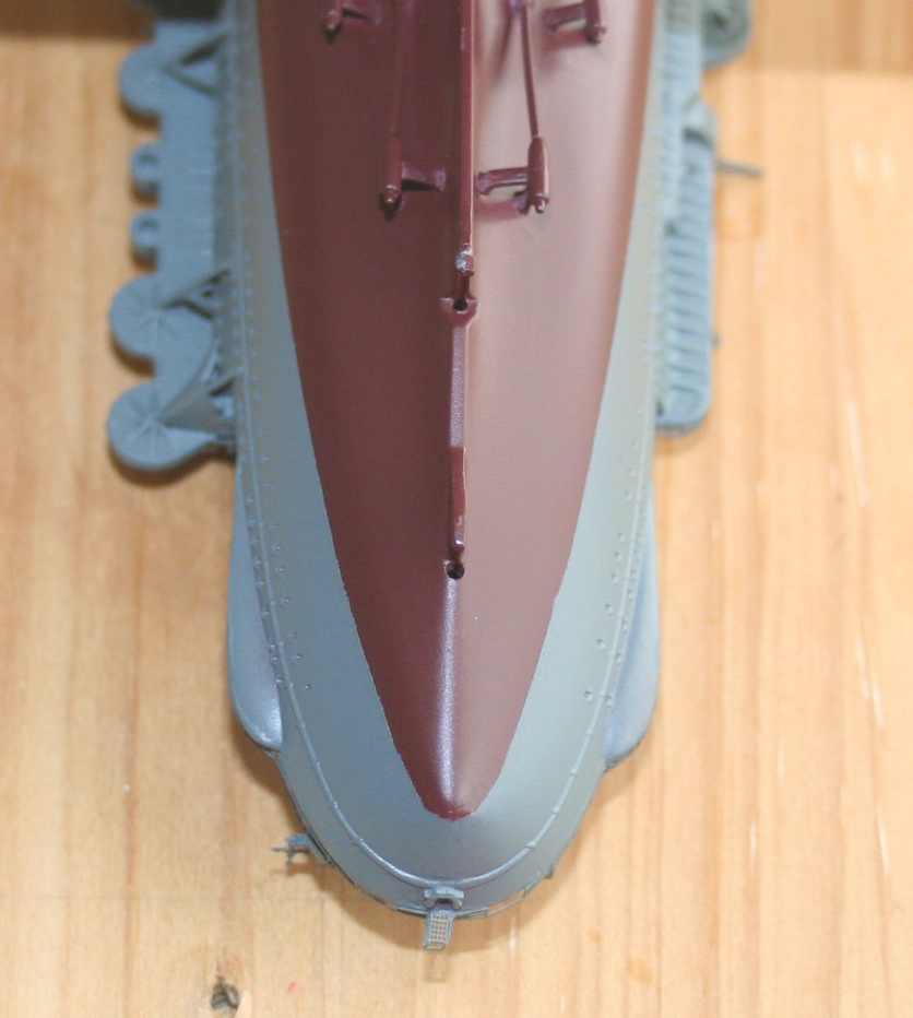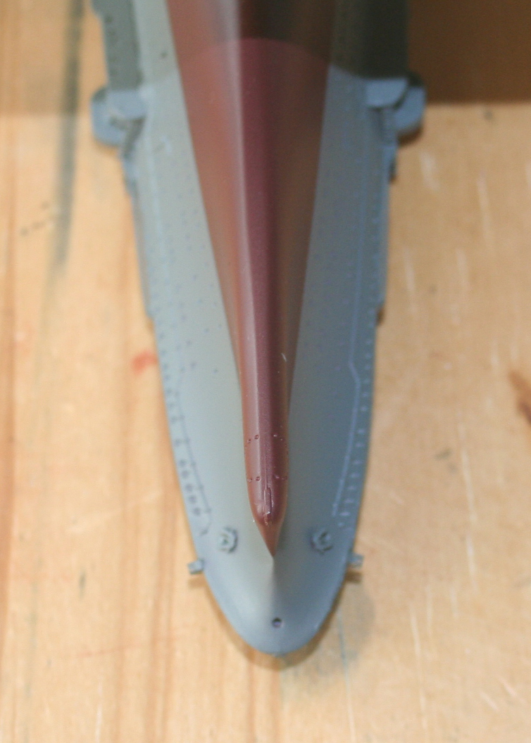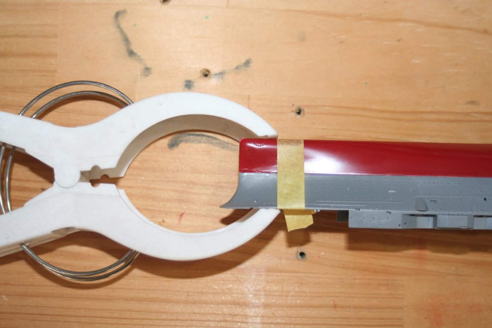 ここで一旦サフなどを吹いて、色合いの違いが出ないようにされる方が多いようですが、船体色のような隠蔽性の高い色は綺麗に下色が消えるので私はそのままサフを吹かずに塗っています。