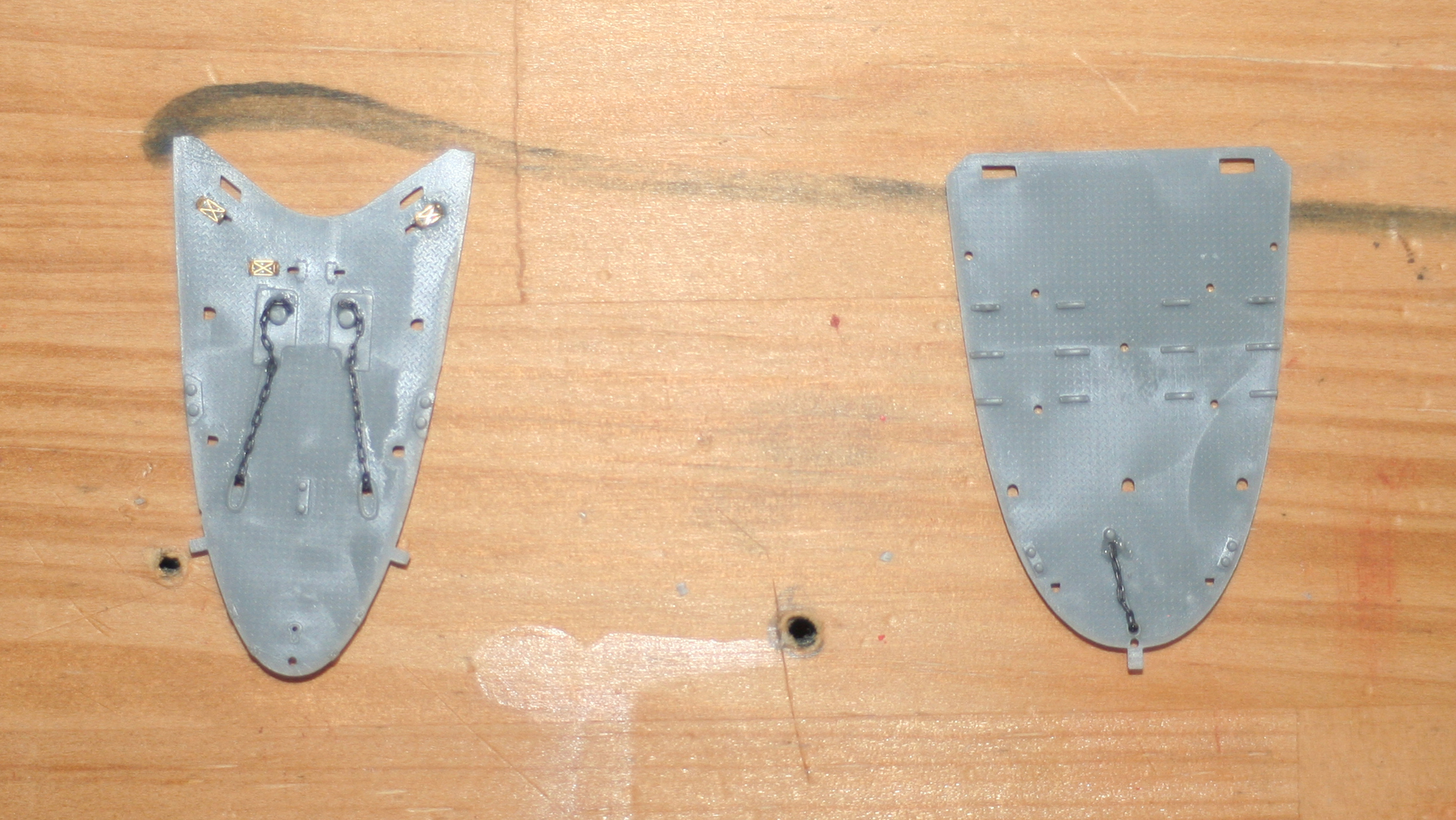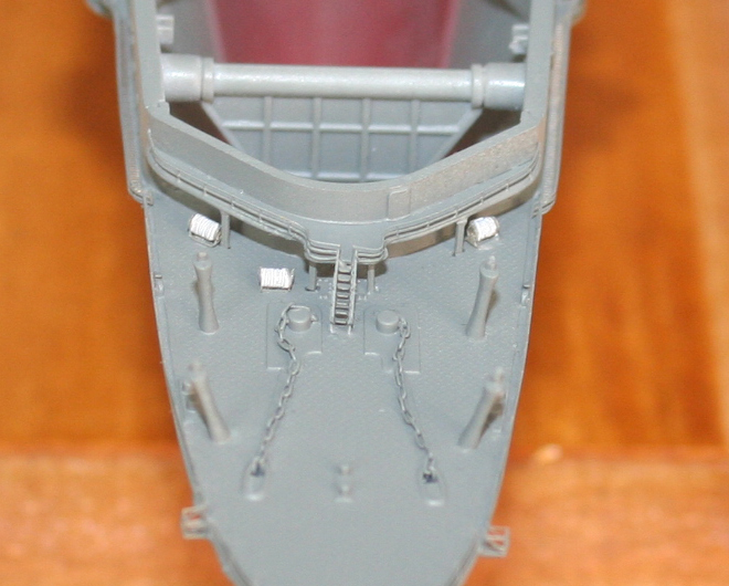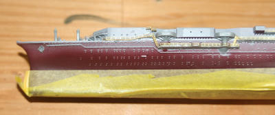 実はここで大失敗、前甲板から側舷に繋がるパーツをつけたのですが、これがエッチングにすべて置き換わる部分でした。