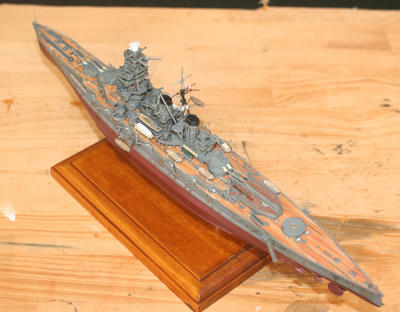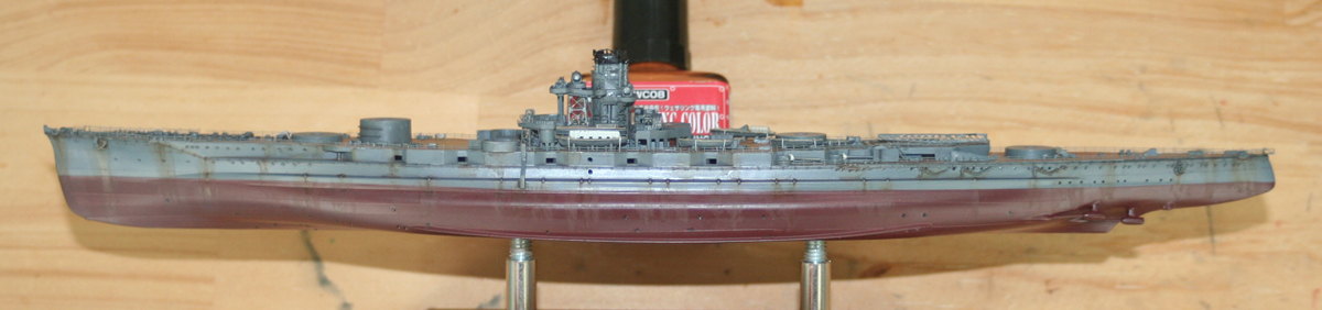 艦橋やマストなどのデリケートな部分を付ける前に船体の汚しを入れます。
